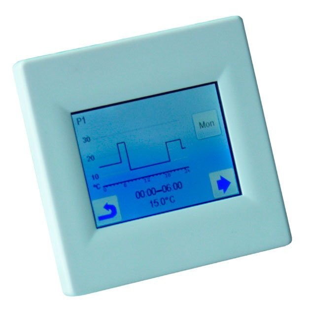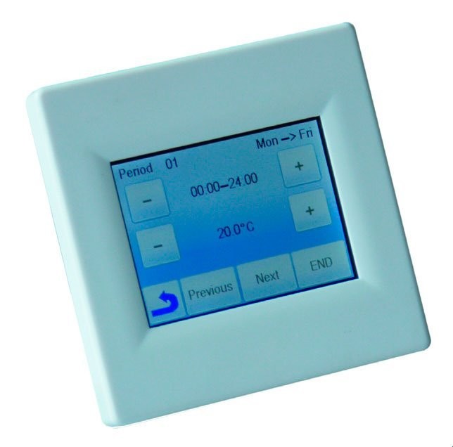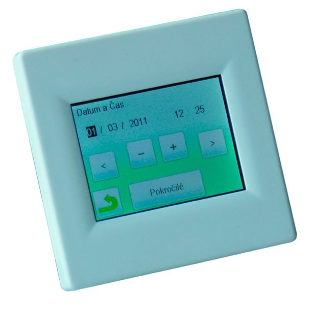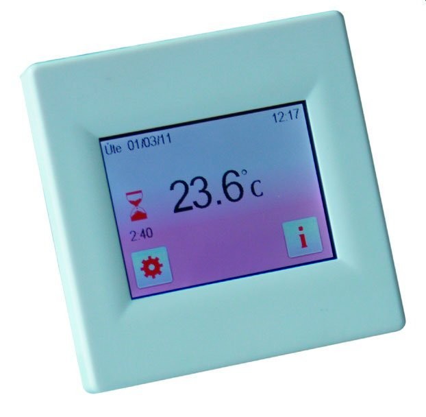 Programovatelný univerzální termostat - snímá teplotu prostoru i podlahy. Dotykový (uzamykatelný) displej s volitelnou barvou pozadí, CZ menu, volba měřených teplot: "podlaha/prostor/podlaha+prostor/2x podlaha+prostor"; nastavitelný typ regulace: pevná teplotní diference nebo PWM (pulzní šířková modulace); počítání provozních nákladů (den/měsíc/rok); zobrazení teploty prostoru i podlahy.