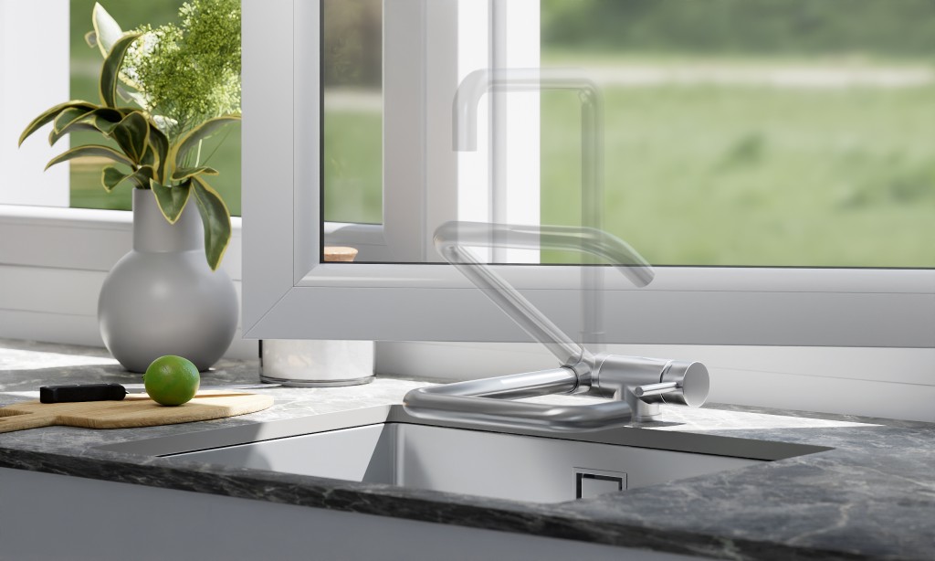 Theta je jednopáková, stojanková kuchynská batéria s jedinečným tvarom. Toto riešenie je určené pre drezy umiestnené pod oknom, pretože batéria má úplne sklopný výtok - rozsah pohybu je 90 ° av zloženom stave je jej výška iba 6,6 cm. Pre väčšie pohodlie je výtok otočný a rukoväť bola predĺžená na zaistenie ergonomického použitia.