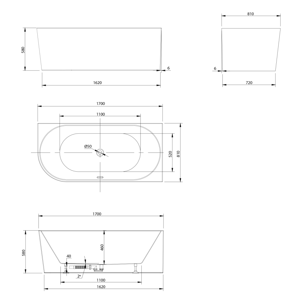 Súčasťou vane je prepadová súprava, výpusť s click-clack zátkou a sifón