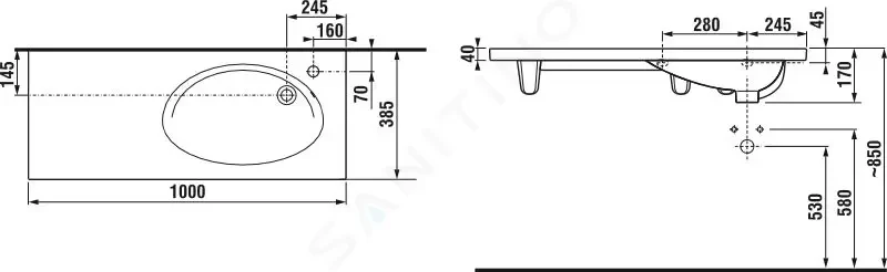 Moderné asymetrické umývadlo 100 cm ponúkame s otvorom pre batériu vľavo či vpravo (prípadne bez otvoru) je hlboké 38,5 cm, takže aj do neveľkej kúpeľne prináša komfort väčšieho privátneho priestoru.