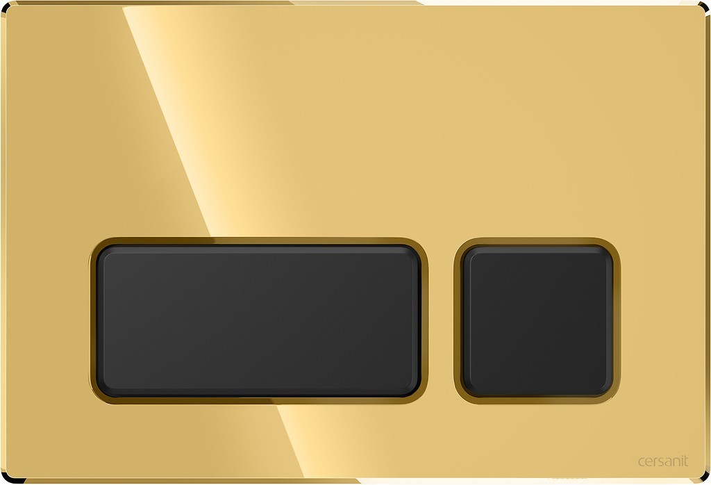 Ovládací tlačítko BLOCK v lesklé zlaté barvě s obdélníkovými matně černými tlačítky. Design tlačítka využívá komponenty vyrobené z materiálů v různých barvách. Tato kombinace, vytvořená s využitím módních barev, dodá vašemu interiéru jedinečný vzhled a zdůrazní individuální charakter celého designu koupelny. Pro konstrukci tlačítka byly použity nejkvalitnější materiály, což se odráží ve spolehlivosti produktu. Ovládací tlačítko je navrženo pro duální, úsporný systém splachování. Ovládací tlačítko je kompatibilní s podomítkovými rámečky AQUA MECH. Je kompatibilní se systémem FRESH SYSTEM, který je ideálním řešením ve spojení s technologií CleanOn bez okraje, kde absence okraje nevylučuje použití osvěžovačů vzduchu. Toto komplexní, moderní řešení zaručuje dokonalou hygienu toalety. Propracovaný design tlačítka zajišťuje rychlou a snadnou instalaci.