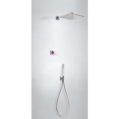 Termostatický podomietkový elektronický sprchový set SHOWER TECHNOLOGY; - Zabudovaná termostatická elektronická kontrolná jednotka (2-cestná). - Pevná sprcha 300x300 mm. s kĺbom. Materiál Mosadz (1.34.138.30).- Držiak s nástenným prívodom vody (207.182.01).- Ručná sprcha, proti usadz. vôd. kameňa (202.639.01).- Flexi hadica SATIN (91.34.609.15): v chrómovom prevedení