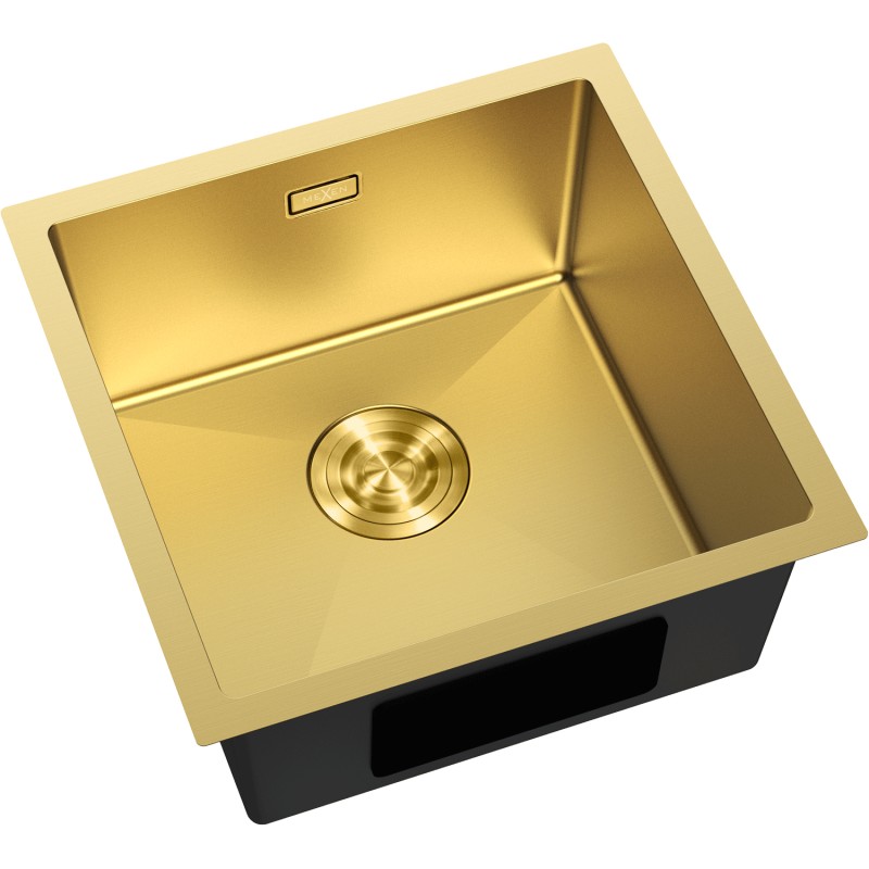 Špecifikácia produktu: Rozmer: 440x440x200 mm Hĺbka drezu: 200 mm Rozmery drezu: 390x390 mm Hrúbka oceľového hrán drezu: 3 mm Hrúbka oceľového hrán drezu: 1 mm Polomer zaoblenia rohov drezu: Typ-2: Priemer-2 Pod dosku Materiál: Nerezová oceľ AISI 304 Farba: Zlatá Povrch: Hladký Povrchová úprava sifónu: Zlatá Otvor pre prepad: Áno Otvor pre batériu: Nie Ručný sifón s odpadkovým košom a zátkou Prídavný kryt odtoku Skrytý otvor pre prepad Zvukovo izolačná rohož farby Odolnosť voči vysokým teplotám a tepelným šokom Povrch pre ľahké čistenie