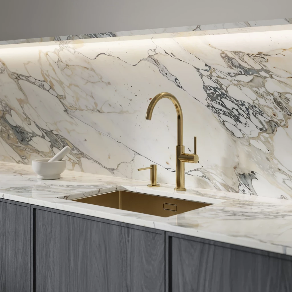 Kartáčovaná mosadz je ušľachtilá povrchová úprava v odtieni studeného zlata a saténu, kartáčovaný povrch.