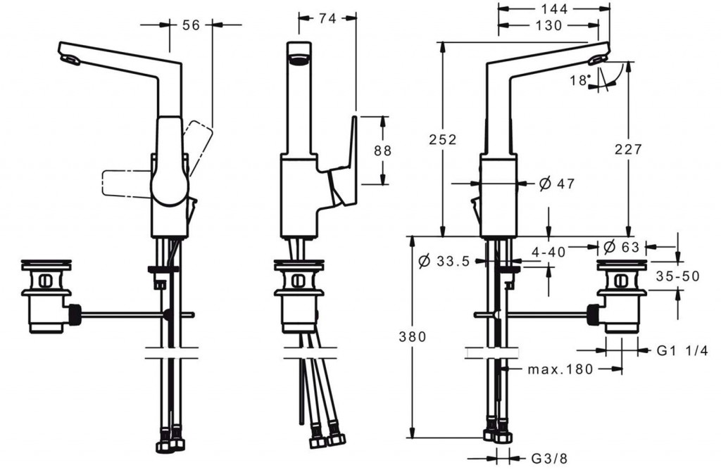 výtok: liaty, o 150 ° otočný (-) vyberateľná zarážka