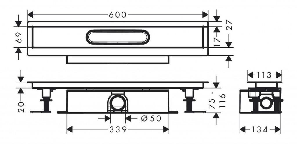 Kompletná sada lineárneho sprchového žľabu uBox universal 600, pre štandardnú inštaláciu