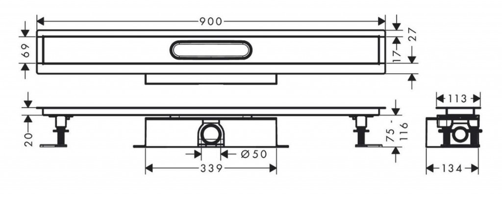 Kompletná sada lineárneho sprchového žľabu uBox universal 900, pre štandardnú inštaláciu
