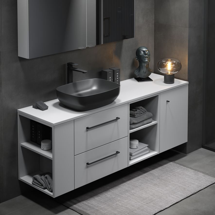 Kúpeľňový nábytok LARGA je dostupný v troch farebných variantoch: biela, šedá a modrá, ktoré je možné konfigurovať s pracovnými doskami rôznych farieb. Nábytok dopĺňajú kovové úchytky, gombíky a nohy v zlatej, čiernej a striebornej farbe.