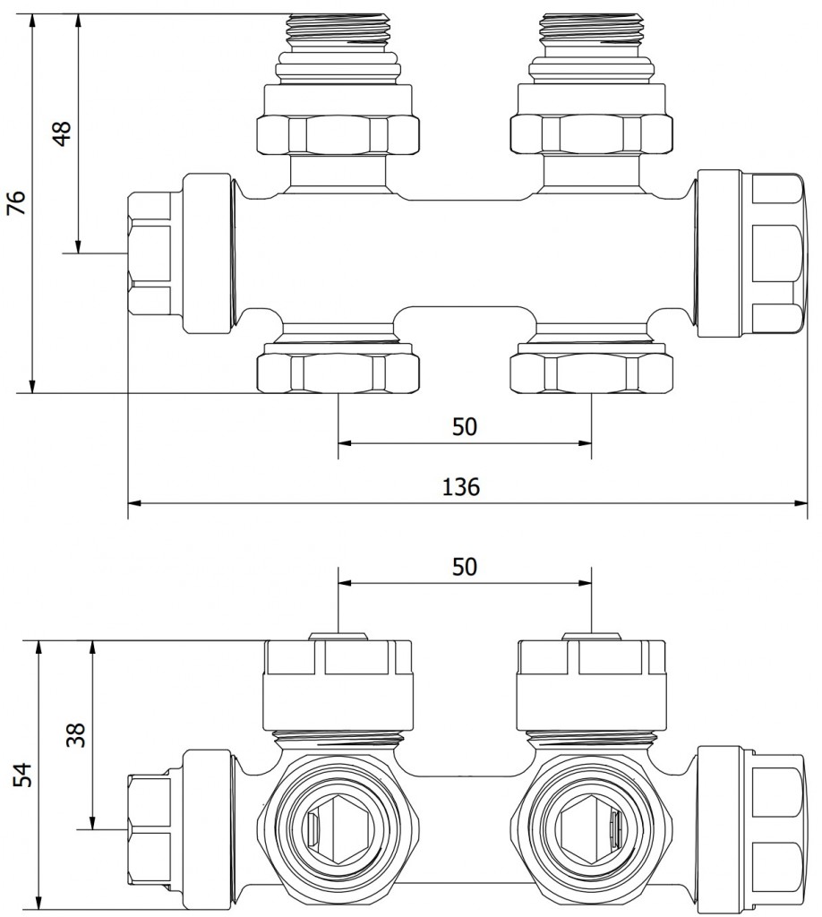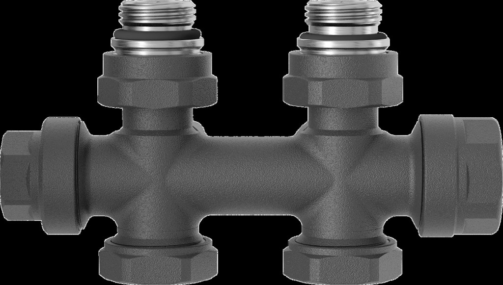 Uni-Term uhlový ventil pre radiátor s rozstupom 50 mm , obojstranný. Tento typ pripojenia je navrhnutý tak, aby sa pripájal k radiátoru v strede jeho spodnej časti . Výhodou stredového pripojenia je, že poskytuje čistejší a estetickejší vzhľad, pretože potrubie je menej viditeľné a je ľahšie ho integrovať do designu miestnosti.