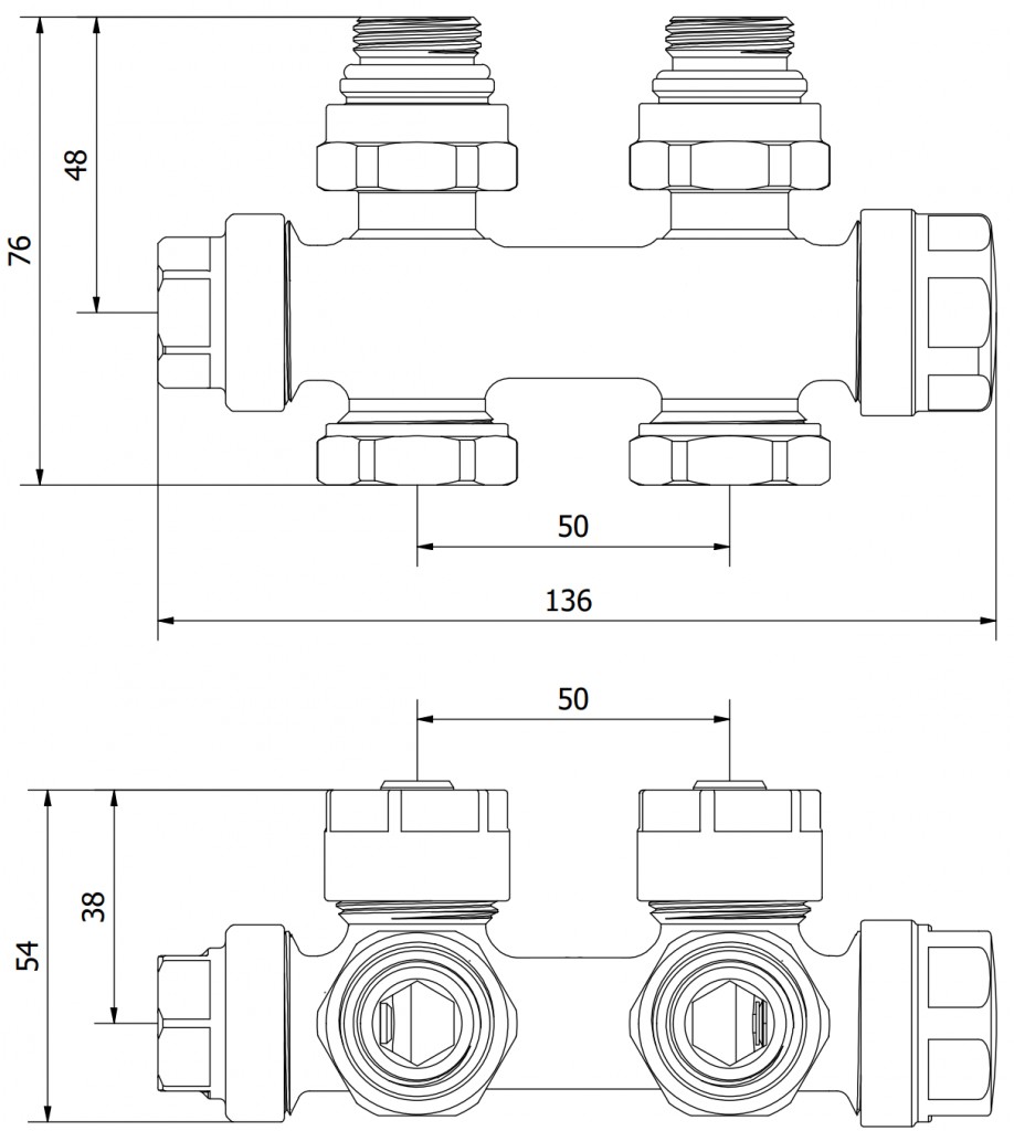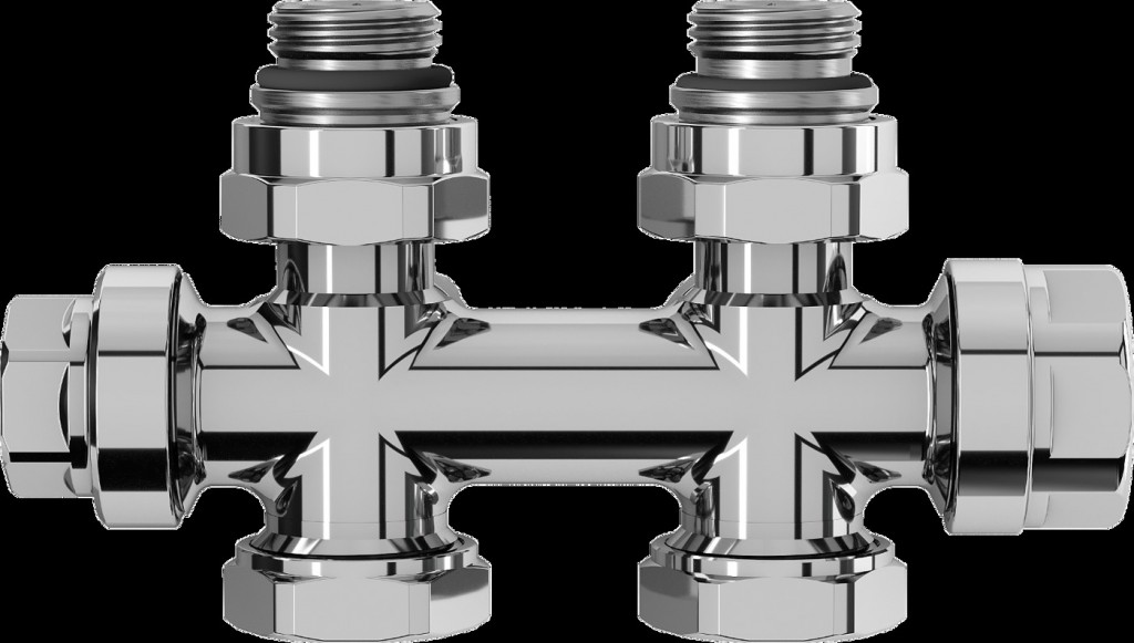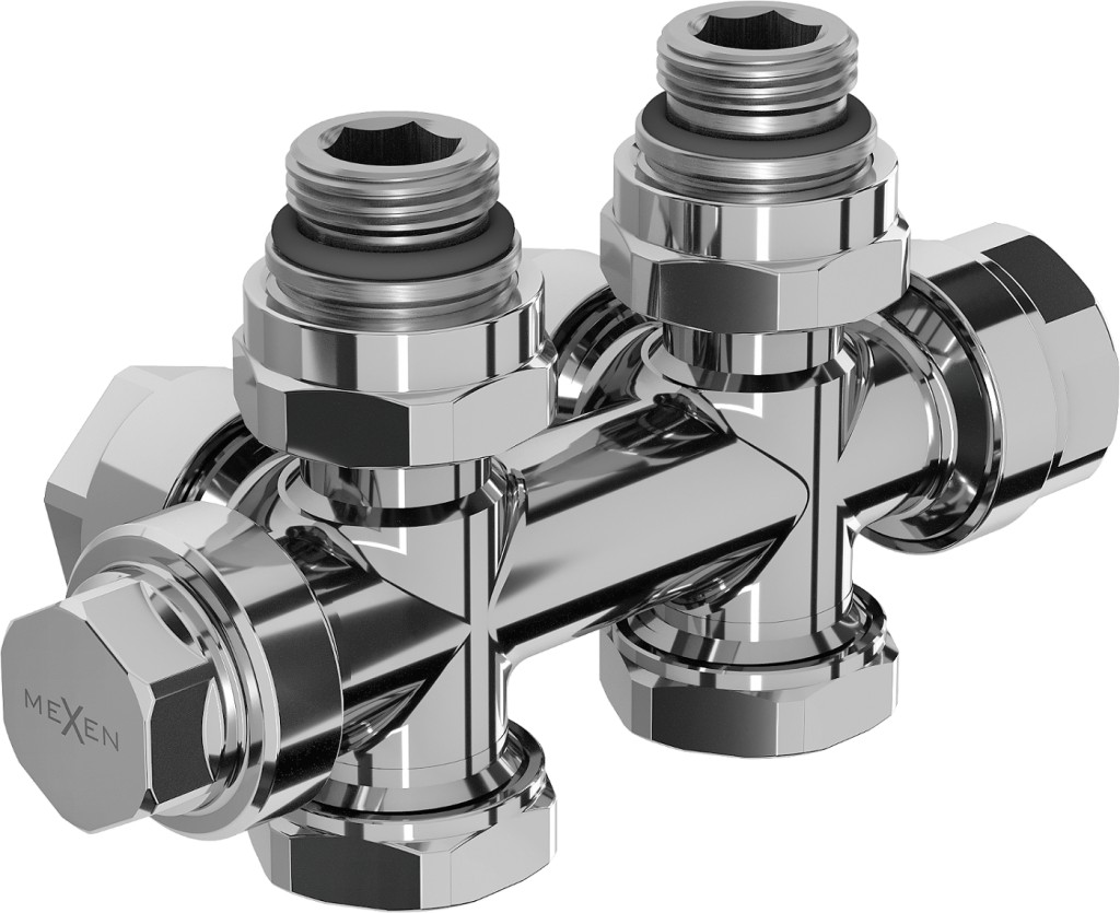 Uni-Term uhlový ventil pre radiátor s rozstupom 50 mm , obojstranný. Tento typ pripojenia je navrhnutý tak, aby sa pripájal k radiátoru v strede jeho spodnej časti . Výhodou stredového pripojenia je, že poskytuje čistejší a estetickejší vzhľad, pretože potrubie je menej viditeľné a je ľahšie ho integrovať do designu miestnosti.