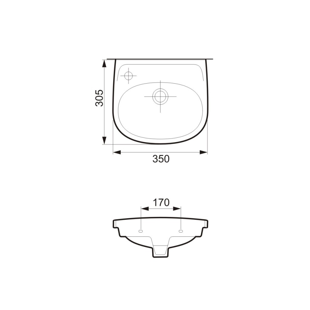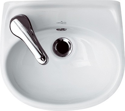 Nástenné umývadielko s prepadom a otvorom na batériu na ľavej strane. Odporúčaná montáž s dekoratívnym sifónom.