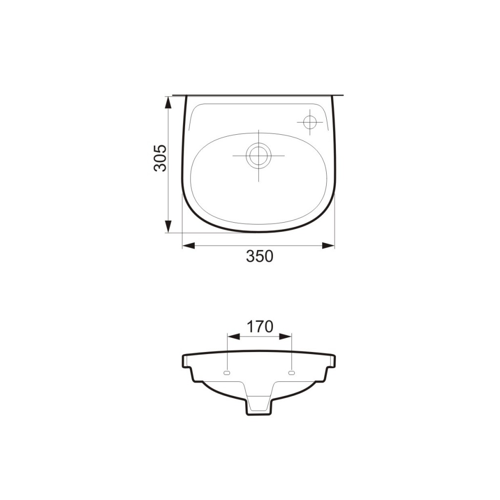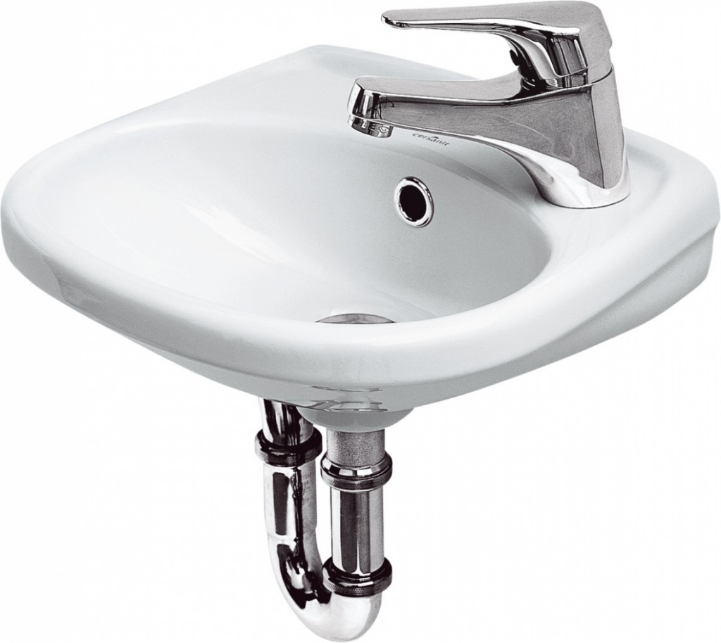 Nástenné umývadielko s prepadom a otvorom na batériu na pravej strane. Odporúčaná montáž s dekoratívnym sifónom.
