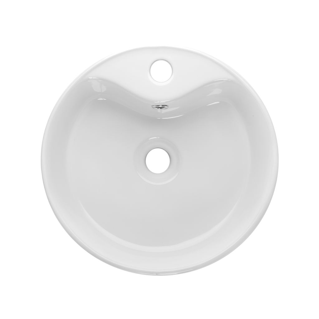 Okrúhle umývadlo na dosku s otvorom na batérie a prepadom.