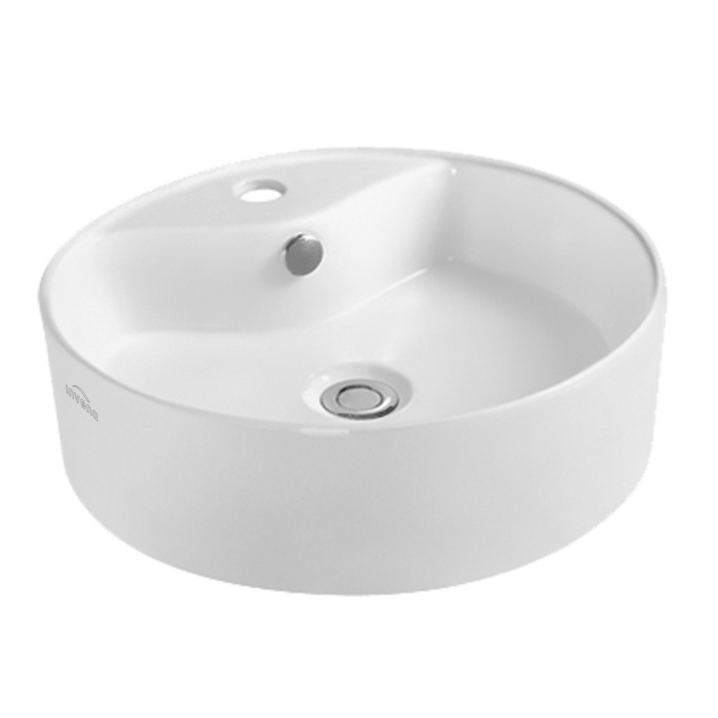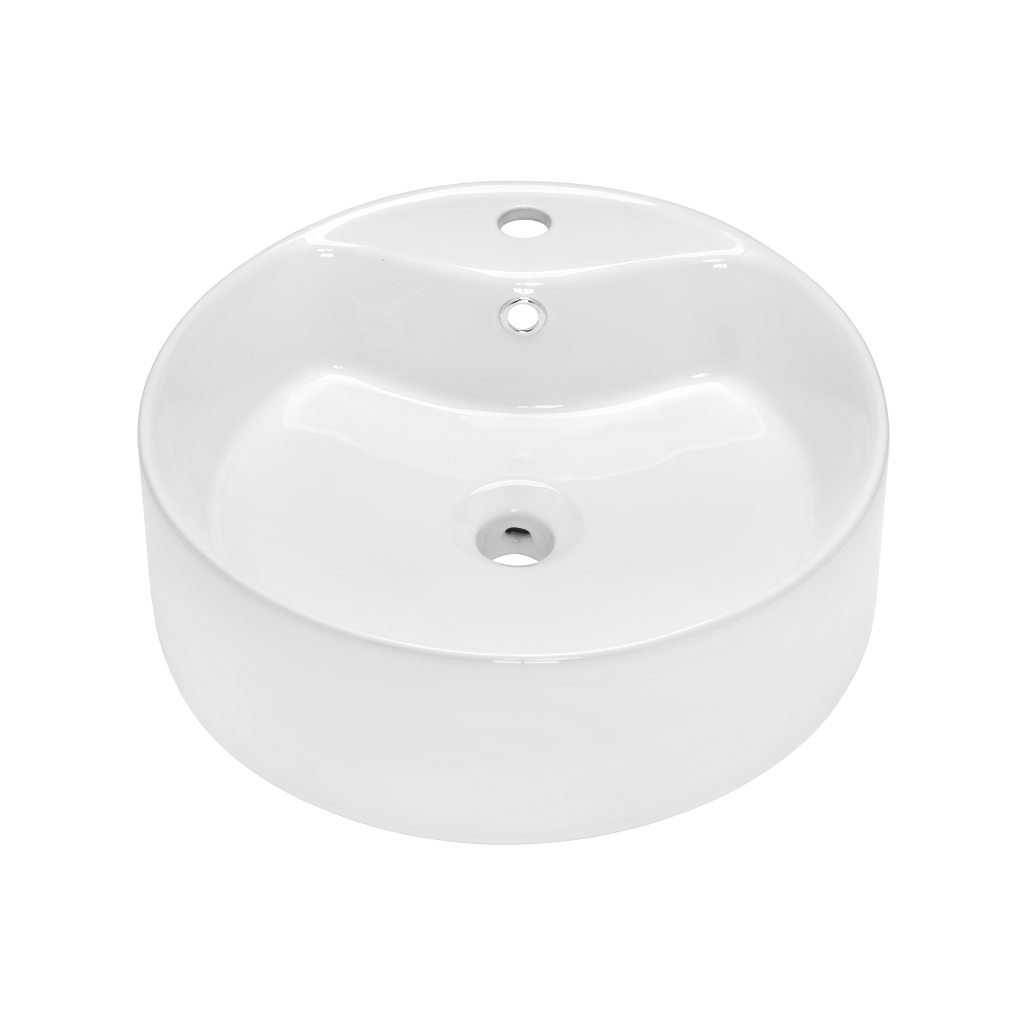 Okrúhle umývadlo na dosku s otvorom na batérie a prepadom.