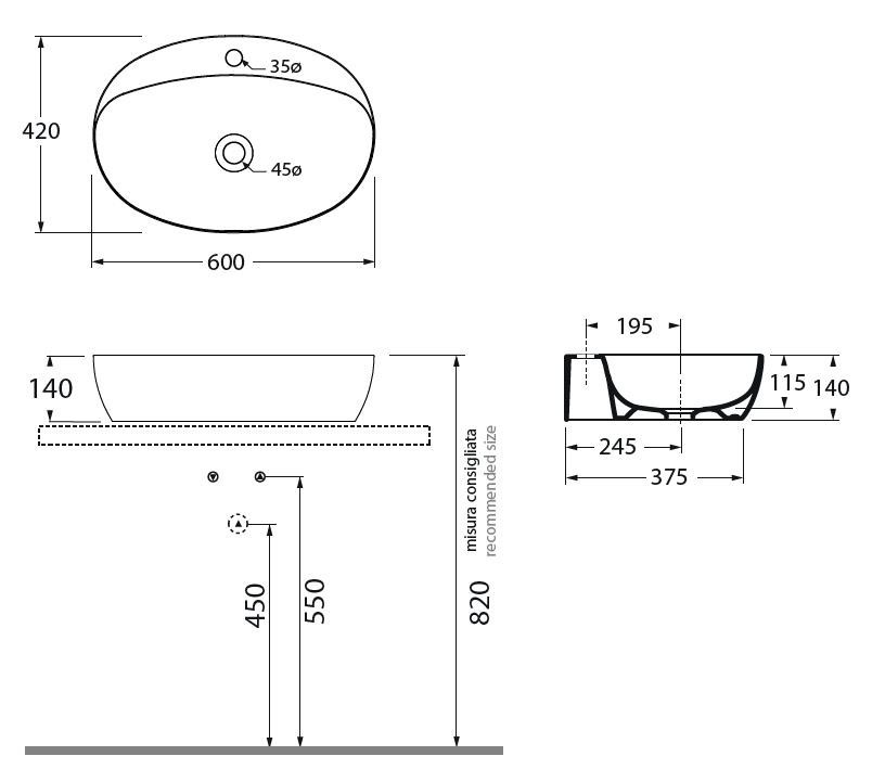 Rozmery umývadiel na dosku CIRCLE 2:- 60 × 42 × 14 cm