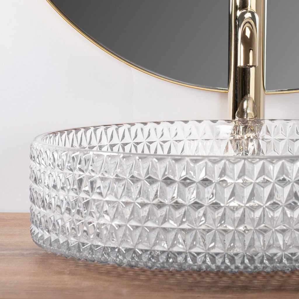 Moderné krištáľové umývadlo zo série Cristal sa bude krásne vynímať vo vašej štýlovej kúpeľni. Je vyrobené z vysoko kvalitného skla a je možné ho namontovať na pracovnú dosku alebo skrinku. Zaujímavý vizuálny efekt podčiarkne svetlo odrážajúce sa v kryštáloch. Sklenené umývadlo s krištáľovou úpravou bezpochyby vyniká zaujímavým dizajnom.
