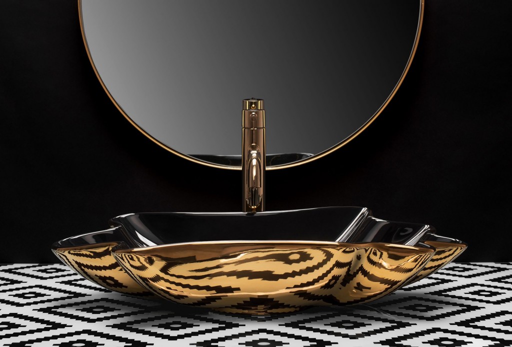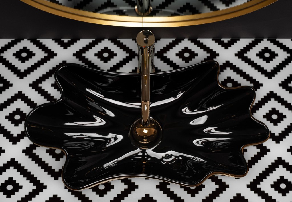 Umývadlo je vyrobené z najkvalitnejšej čiernej keramiky a má oválny, vlnitý tvar. Umývadlo je zakončené zlatým lemom, ktorý dáva krásny konečný výsledok. Umývadlo je neuveriteľne atraktívne na pohľad, je ideálne pre milovníkov neštandardných tvarov, vnáša eleganciu do zariadenia kúpeľne doma aj v kancelárii.