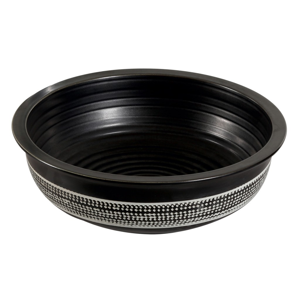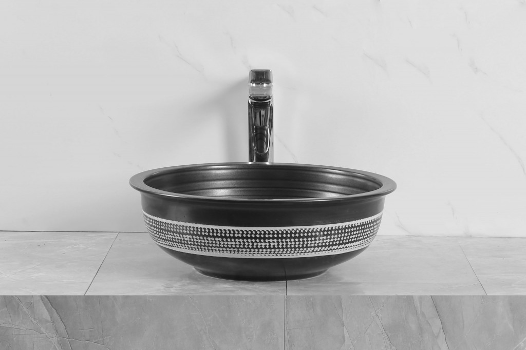 Čierne umývadlo na dosku s bielymi dekoráciami.