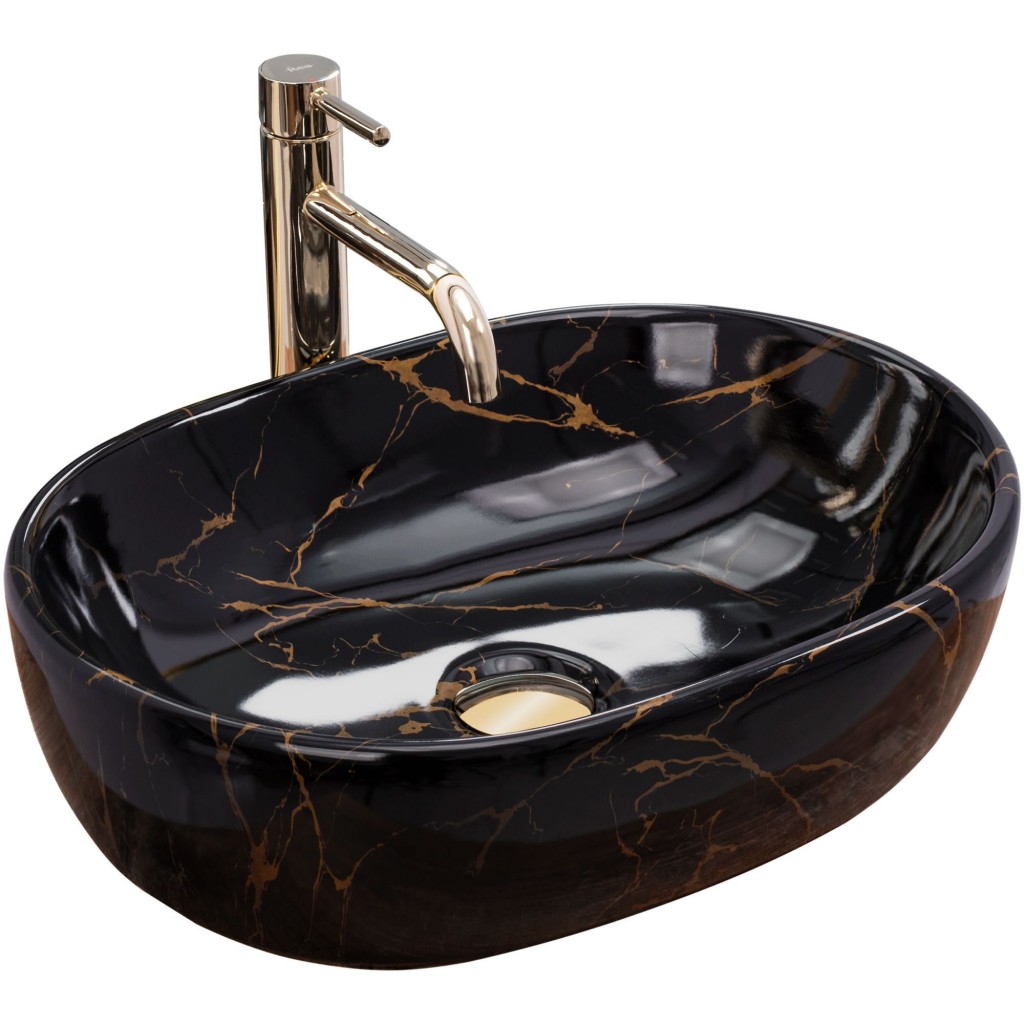 Krásne a extrémne funkčné čierne umývadlo Amelia so zlatými žilkami imitujúcimi prírodný kameň. Ide o výrobok, ktorý dokonale vyplní priestor vašej kúpeľne pri zachovaní dokonalého vzhľadu a estetiky interiéru. Umývadlo je určené na montáž na dosku alebo na skrinku. Vďaka špeciálnej výrobnej fáze je odolný a ľahko sa čistí. Najkvalitnejšia sanitárna keramika s lesklou čiernou úpravou upúta pozornosť každého.