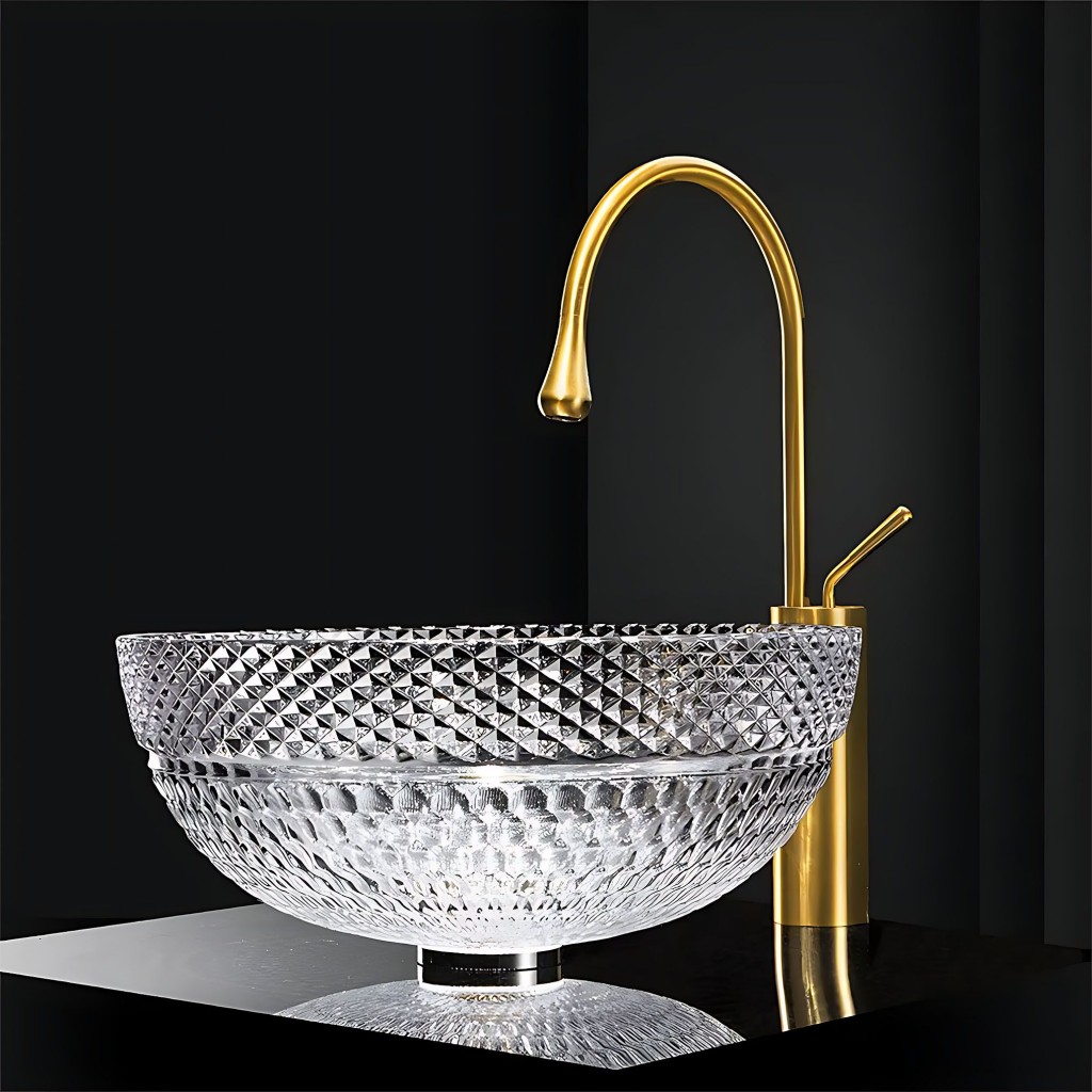 Moderné krištáľové umývadlo zo série Cristal sa bude vo vašej štýlovej kúpeľni skvele vynímať. Je vyrobené z vysoko kvalitného skla a je vhodný na montáž na pracovnú dosku alebo skrinku. Zaujímavý vizuálny efekt podčiarkuje svetlo odrážajúce sa v kryštáloch. Umývadlo s krištáľovým povrchom sa bezpochyby vyznačuje zaujímavým vzorom a dizajnom, čím dozaista zaujme každého hosťa.