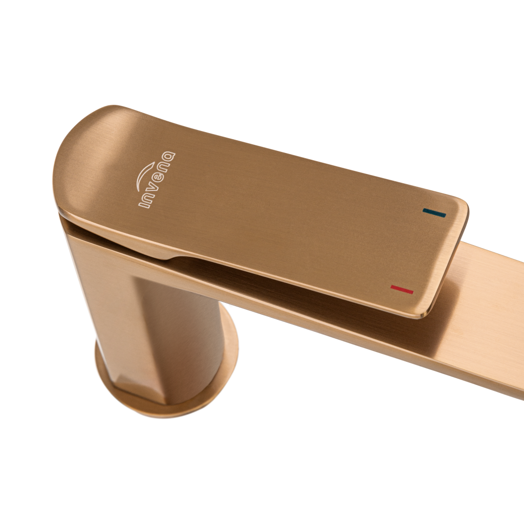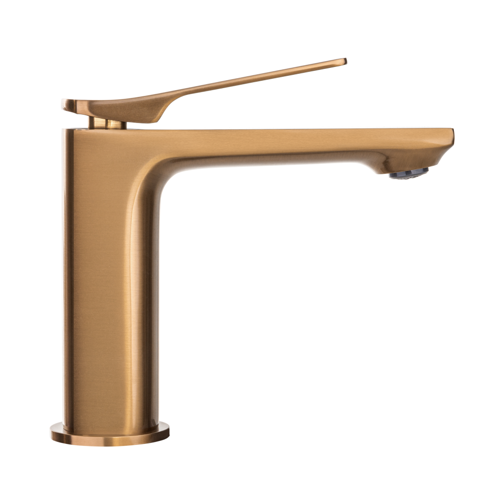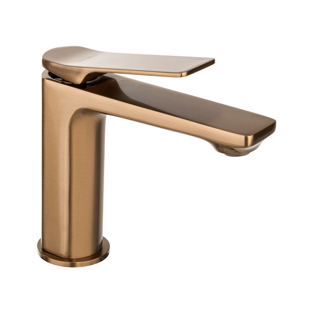 Umývadlová batéria Neri Plus v medenom prevedení s kartáčovaným povrchom je štýlovým a praktickým doplnkom moderných aj industriálnych kúpeľní. Jej kompaktná veľkosť a zaoblený tvar s rukoväťou smerujúcou nahor podčiarkujú minimalistický dizajn, ktorý sa hodí na pracovnú dosku alebo priamo na umývadlo.