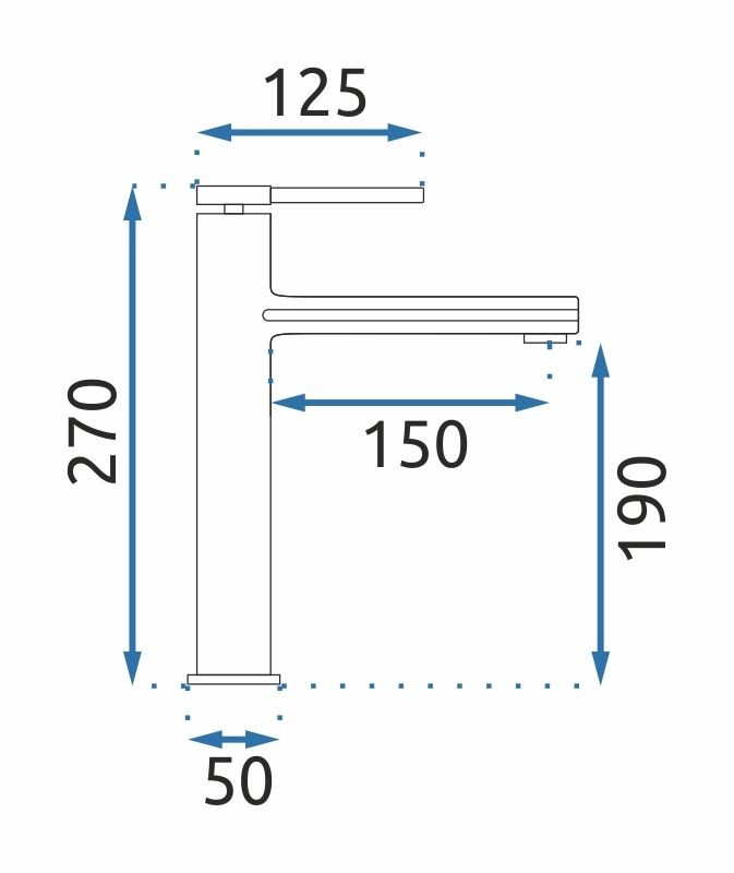 Umývadlová páková batéria s výškou 27 cm je ako stvorená na montáž na dosku vedľa umývadla (bez otvoru pre batériu). Samotná hubica je vo výške 19 cm od dosky, čo vytvára dostatok priestoru pre kúpu vyššieho umývadla . Bola vyrobená z odolnej mosadze a vďaka špeciálnej výrobnej fáze je povrch odolný a ľahko sa čistí.