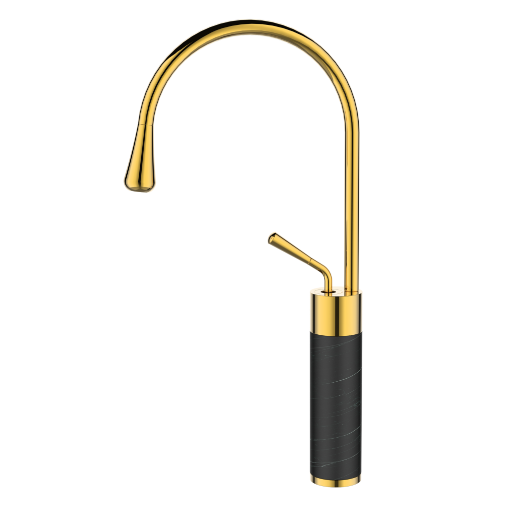 Rozmery balenia kolektív (výška/šírka/hĺbka)[m] : 0,4x0,29x0,52 Množstvo v balení kolektív : 5 KS. Hmotnosť balenia kolektív : 11,46 kg Zlaté kúpeľňové batérie sú obľúbeným riešením v mnohých poľských kúpeľniach. Umývadlová batéria Stone je mimoriadnou kombináciou zlatej a čiernej. Výlevka zlatej farby zakončená subtílnym zvonom je kombinovaná s čiernym kamenným telom s mramorovým vzorom. Výrobok je ideálny pre moderné, očarujúce kúpeľne. Batéria pomôže vytvoriť funkčnú umývadlovú zónu s umývadlom na dosku. Odolný keramický mixér zaručuje funkčné a dlhodobé používanie po roky. Výborná voľba pre milovníkov netradičných riešení.