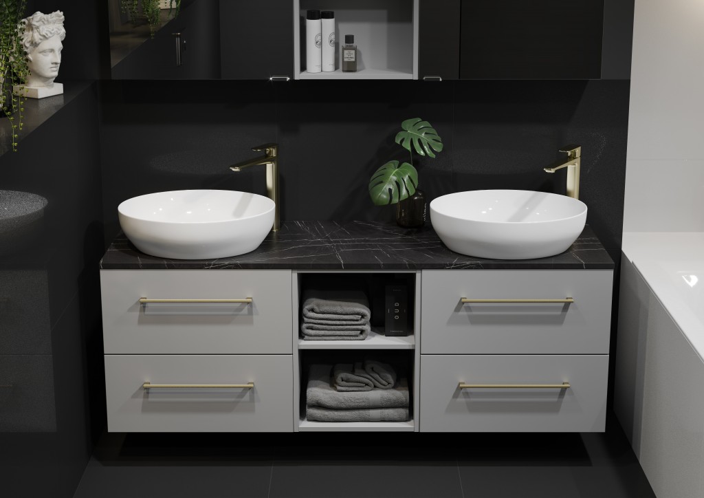 Kúpeľňový nábytok LARGA je dostupný v troch farebných variantoch: biela, šedá a modrá, ktoré je možné konfigurovať s pracovnými doskami rôznych farieb. Nábytok dopĺňajú kovové úchytky, gombíky a nohy v zlatej, čiernej a striebornej farbe.