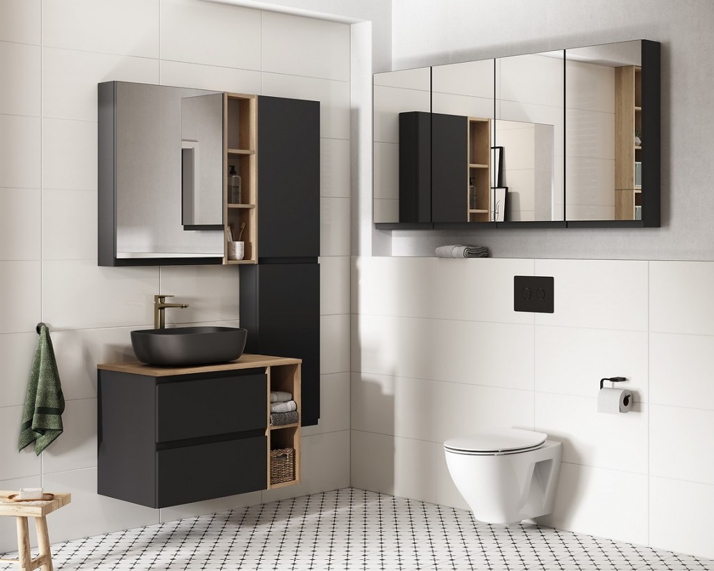 MODUO ponúka funkčné riešenie ako pre malú kúpeľňu, tak aj pre veľkú rodinnú kúpeľňu. Priestranné zásuvky, závesné skrinky a prvky v dubovej farbe sú vynikajúcou voľbou pre ľudí, ktorí oceňujú klasickú