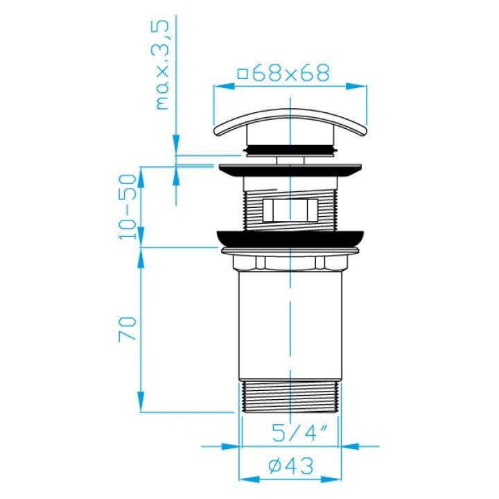 Pochrómovaná umývadlová výpusť s click-clack systémom. Výpust je s hranatou zátkou a je vyrobená z kvalitnej pochrómovanej mosadze.