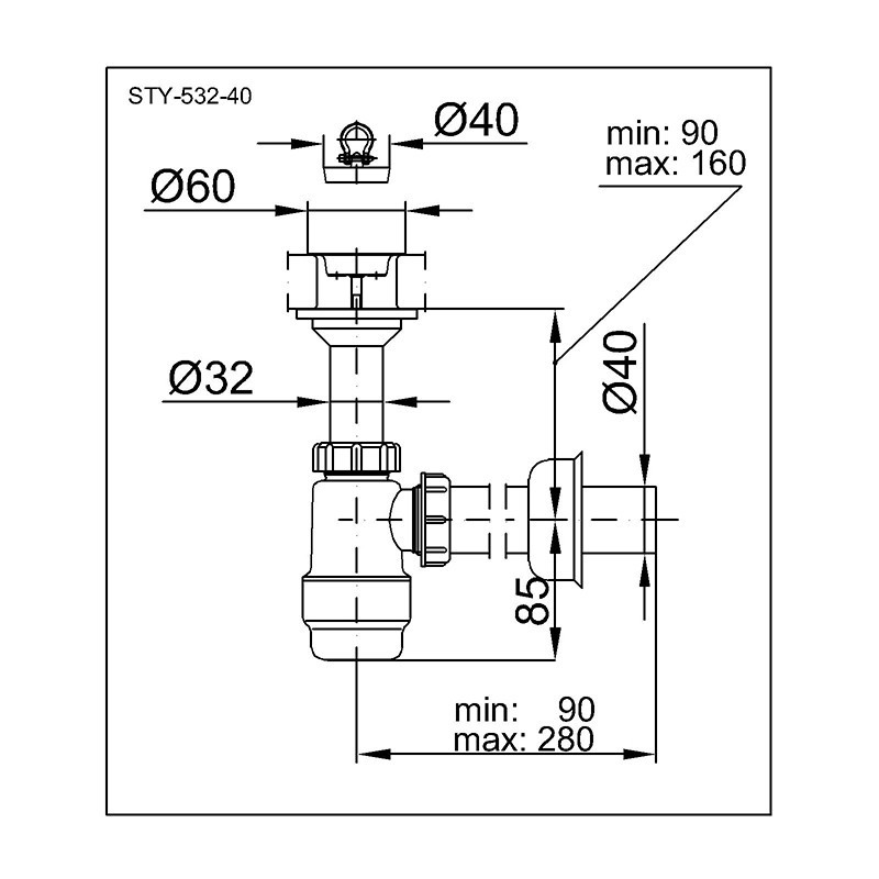 Plastový umývadlový sifón STY-532-40. Vyrobené z veľmi kvalitného pevného plastu s nerezovou mriežkou. Táto kombinácia zaisťuje veľmi dlhú životnosť a spoľahlivosť sifónu.