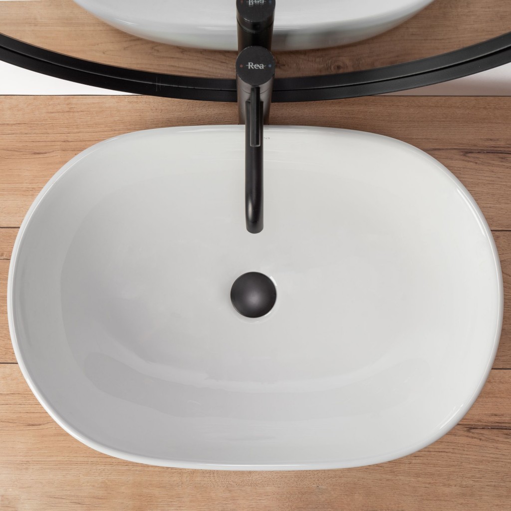 Umývadlo na dosku Rea Amelia 59 s jedinečným vzhľadom a funkčnosťou na najvyššej úrovni. Pokiaľ chcete vašej kúpeľni dať eleganciu a jednoduché použitie, umývadlo Amelia 59 je práve pre vás. Tento výrobok je vyrobený z vysoko kvalitnej sanitárnej keramiky, povrchovo upravený snehovo bielou, lesklú glazúrou. Univerzálny tvar a montáž na stôl sa hodí na mnohé povrchovým úpravám a štýlom.