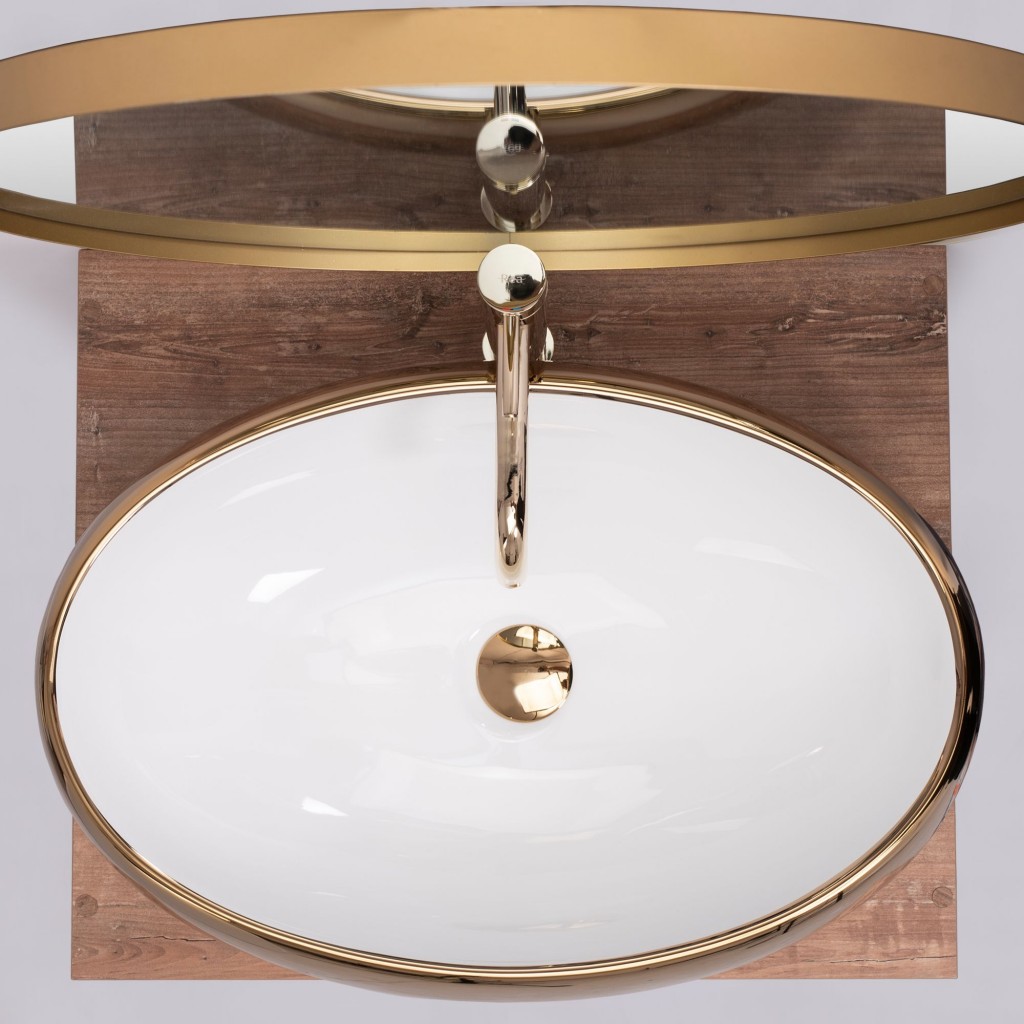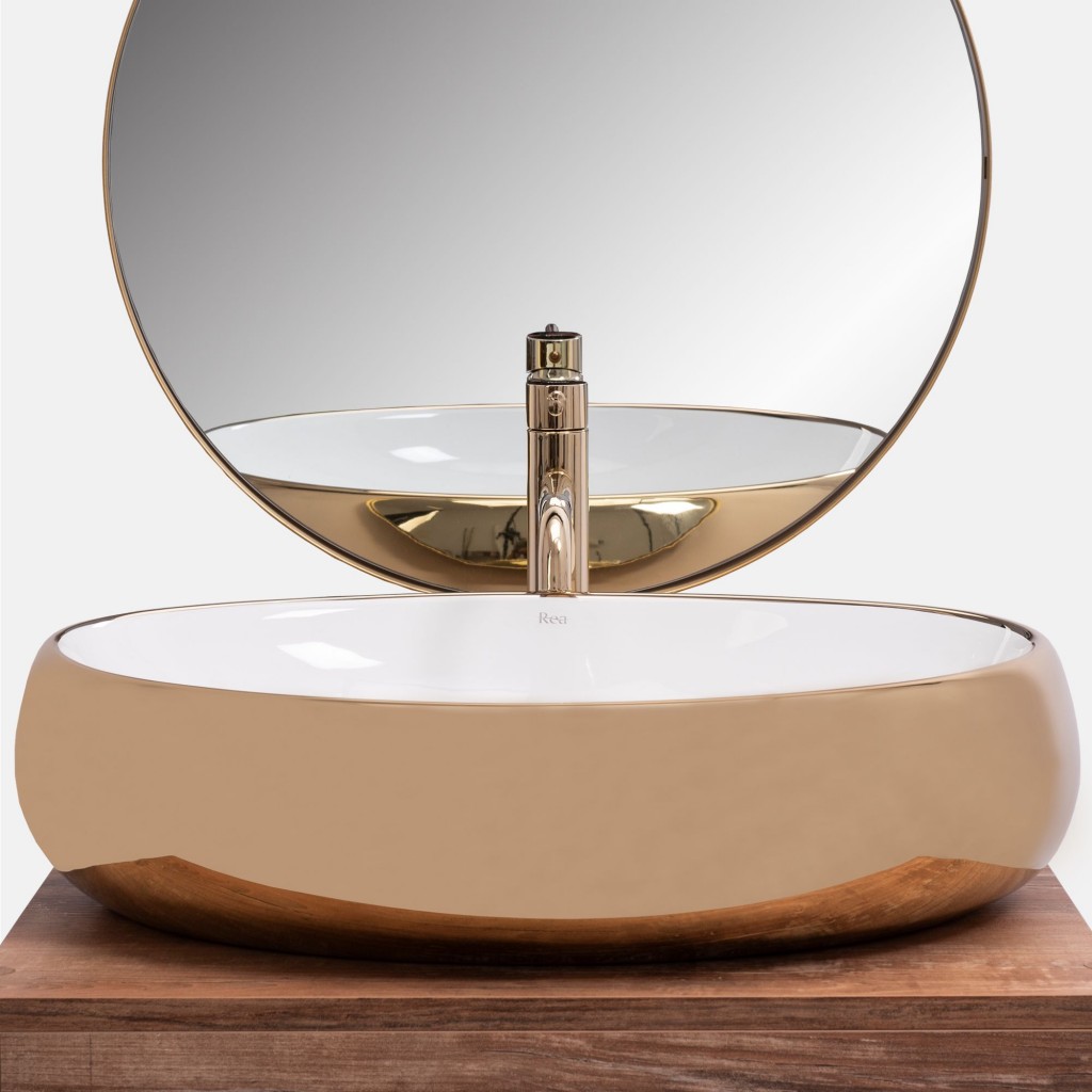 Umývadlo na dosku Rea Melania je súčasťou kolekcie umývadiel Melania, ktorá zahŕňa aj mnoho ďalších variantov umývadiel. Vďaka bielemu vnútra misy sa tento model ľahko čistí. Vonkajší plášť je pokrytý glazúrou so zlatým povrchom, vďaka čomu umývadlo vyniká na pozadí celej kúpeľne a priťahuje pozornosť každého.