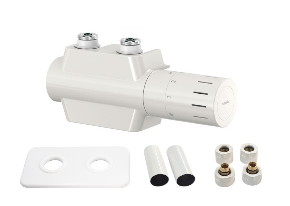 Stredová obojstranná (ľavá aj pravá) termostatická sada UNI vr. 1 krycie rozety a 2 krycích trubičiek (plast) je určená na pripojenie radiátorov na rozvody TÚV s vývodom zo steny aj z podlahy s rozstupom 50mm.