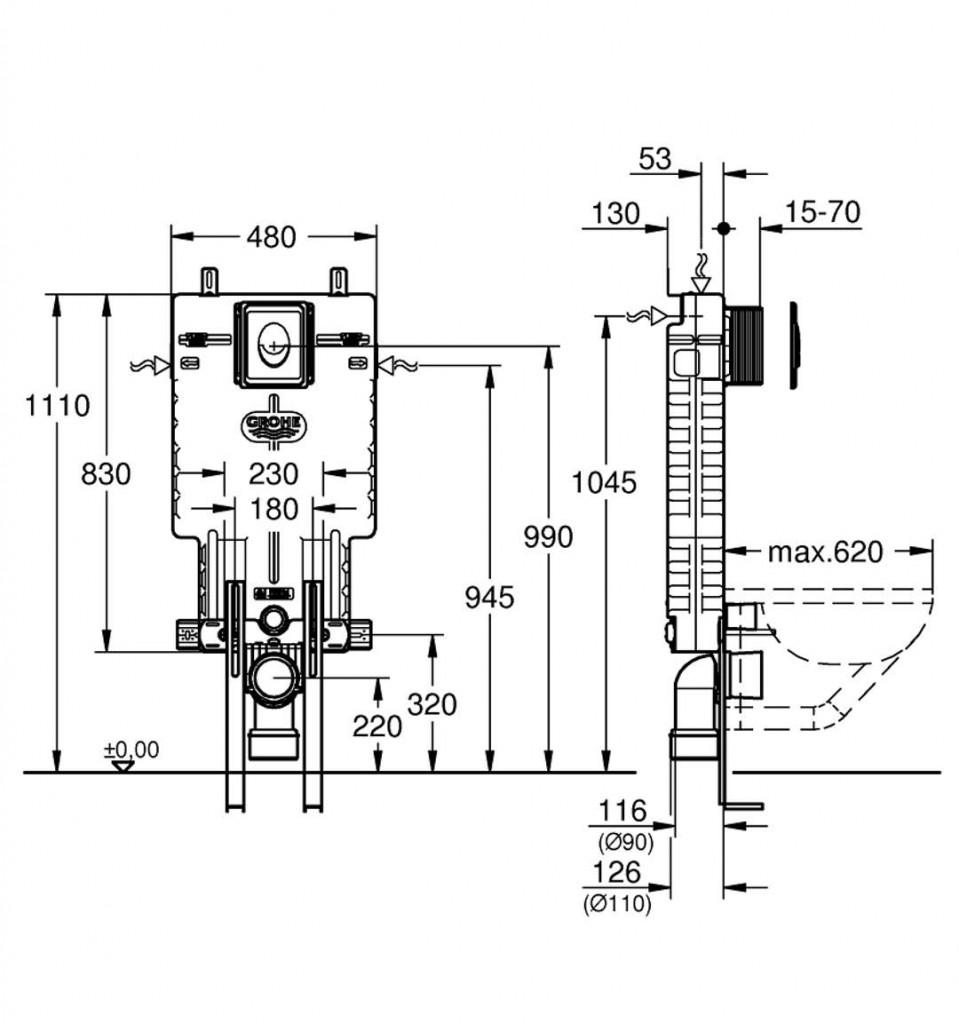 - 2 úchyty pre WC, rozteč skrutiek 180/230 mm
