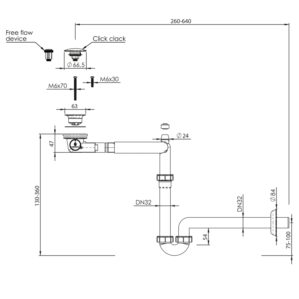Ide o systém, kde rúrka pod umývadlom odvedie vodu k stene a až tam ju odvádza zvisle dole. Toto riešenie je vhodné napríklad do kúpeľňového nábytku, kedy sifón nebráni využitiu police/zásuvky, pre umývadlá s policou alebo k umývadlám pre telesne handicapovaných.