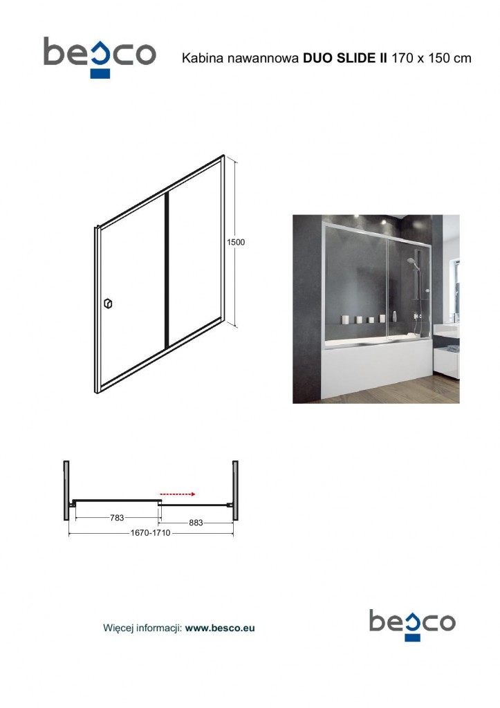 BESCO - Vaňová zástena DUO SLIDE II - Rozmer A - 170 cm, Rozmer C - 150 cm (BCDUSL170CC)