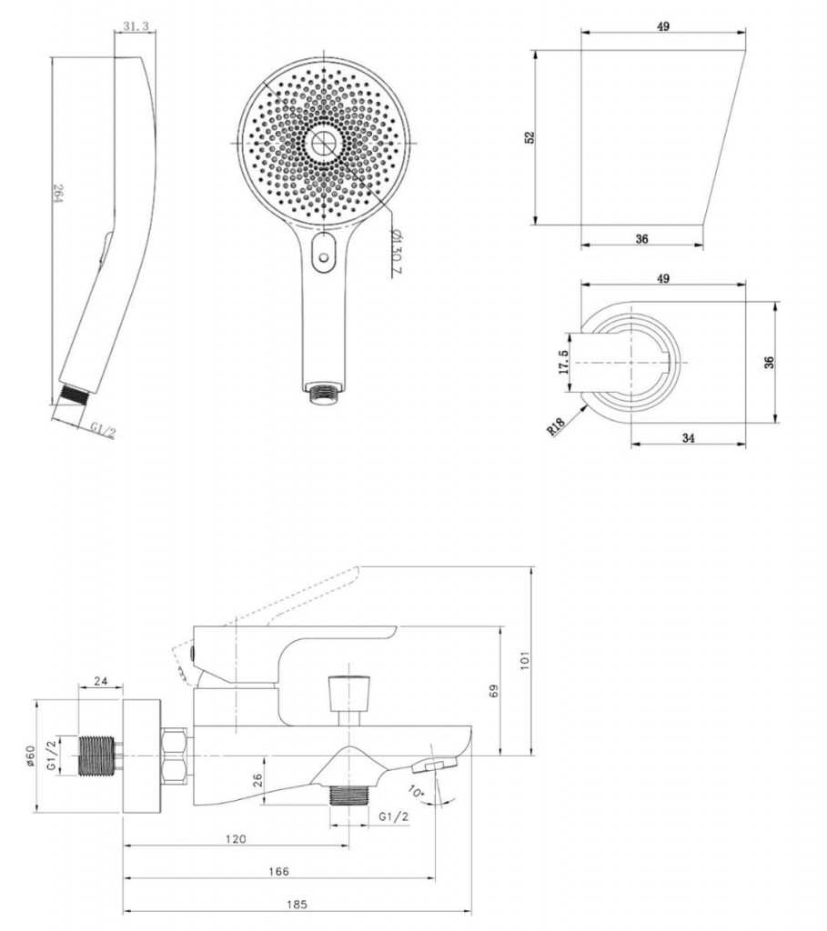ručnú sprchu 130 mm, 3 prúdy