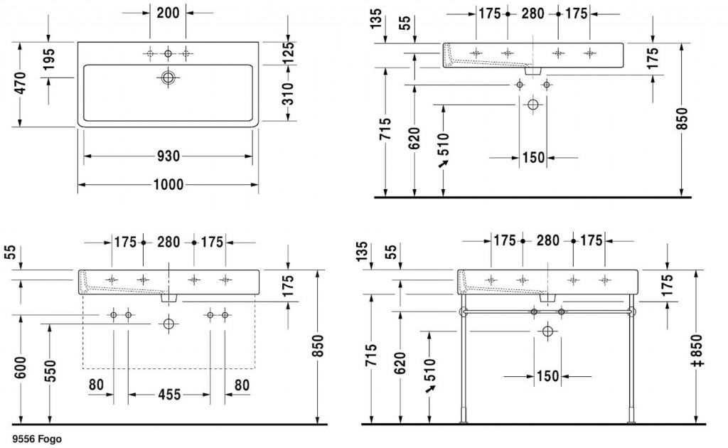 Pre umývadla dĺžky 1000 mm a viac je pri zavesení na stenu potrebné použiť 2 sady pre upevnenie (nie je súčasťou dodávky).