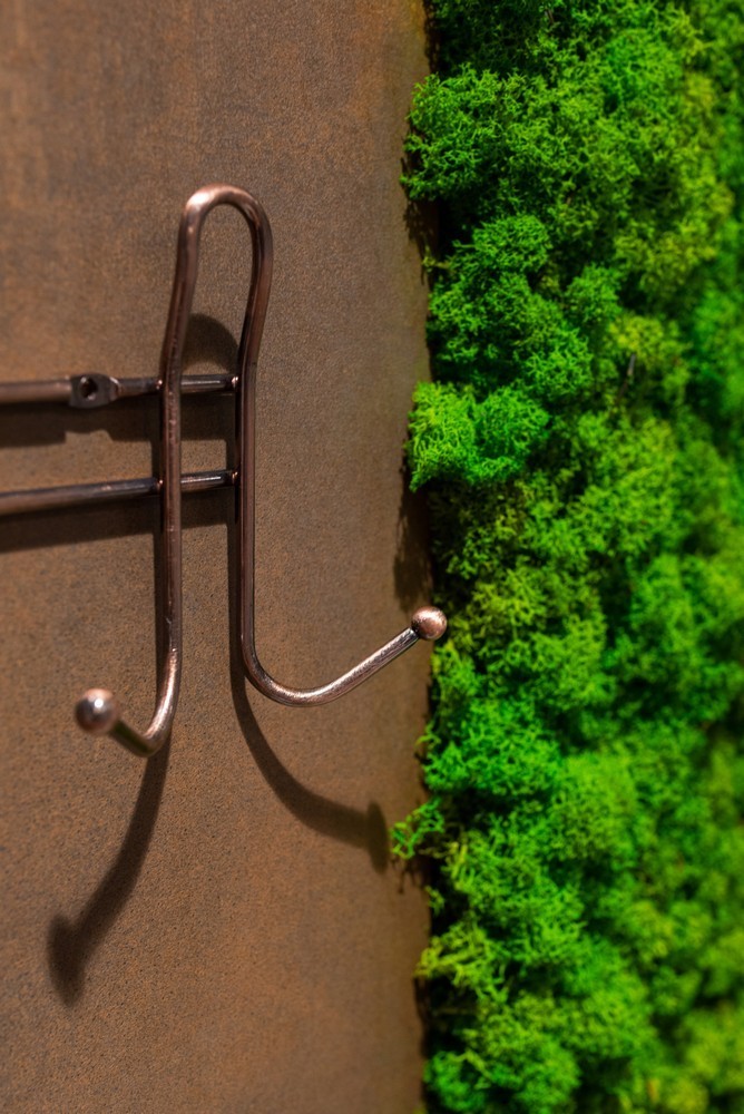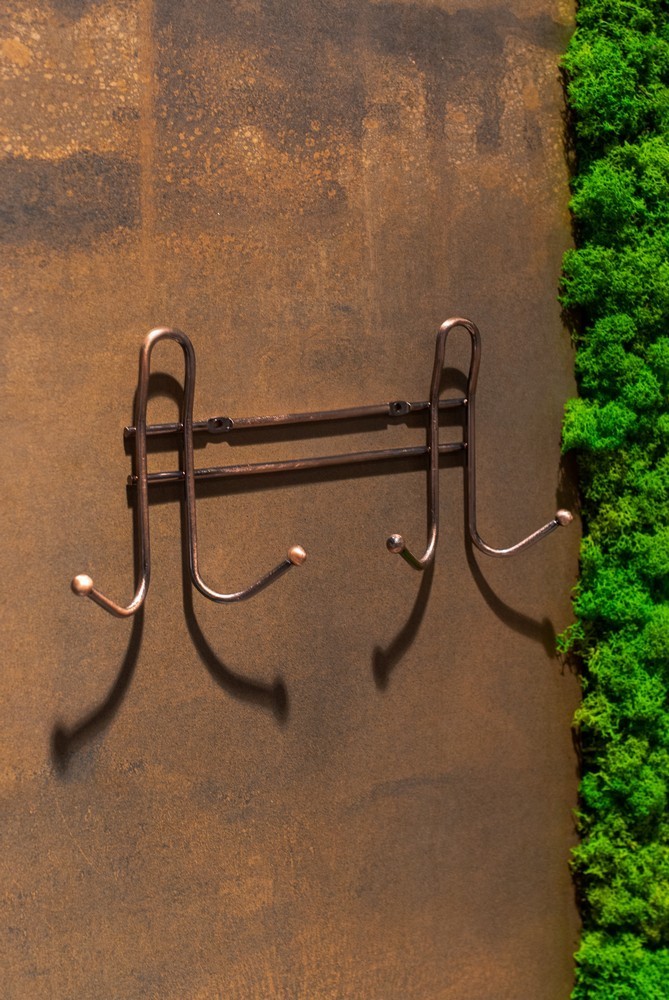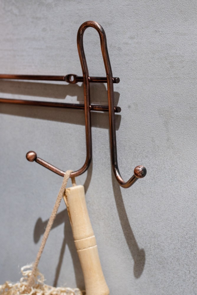 Medený nástenný vešiak so štyrmi háčikmi na zavesenie uterákov, županov alebo oblečenia. Bol precízne vyrobený z pevnej a masívnej ocele lakovanej vo farbe starožitnej medi.