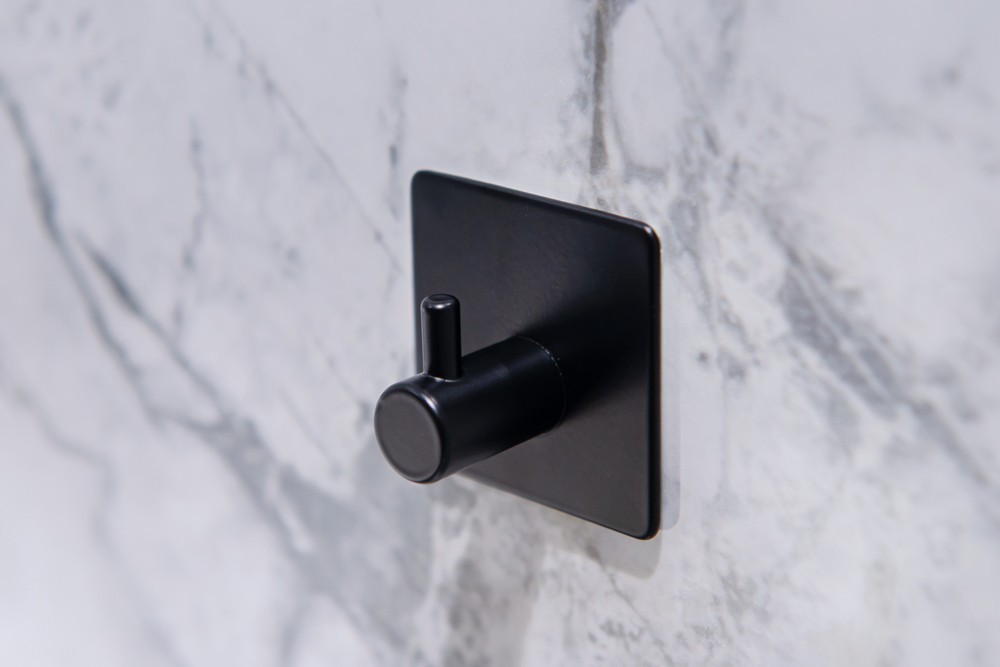 Hranatý vešiak - háčik z kvalitnej, čierno lakovanej, ocele Najväčšou výhodou tohto vešiaka je jednoduché lepenie na obklady pomocou veľmi silnej 3M pásky. Samolepiace kúpeľňové doplnky sú ideálnym riešením, pokiaľ nechcete vŕtať do obkladov. Veľmi kvalitná lepiaca páska 3M priľne k rôznym povrchom a umožňuje ľahké odstránenie doplnkov bez zanechania stôp či poškodenia. Jeho maximálna nosnosť je 4 kg.