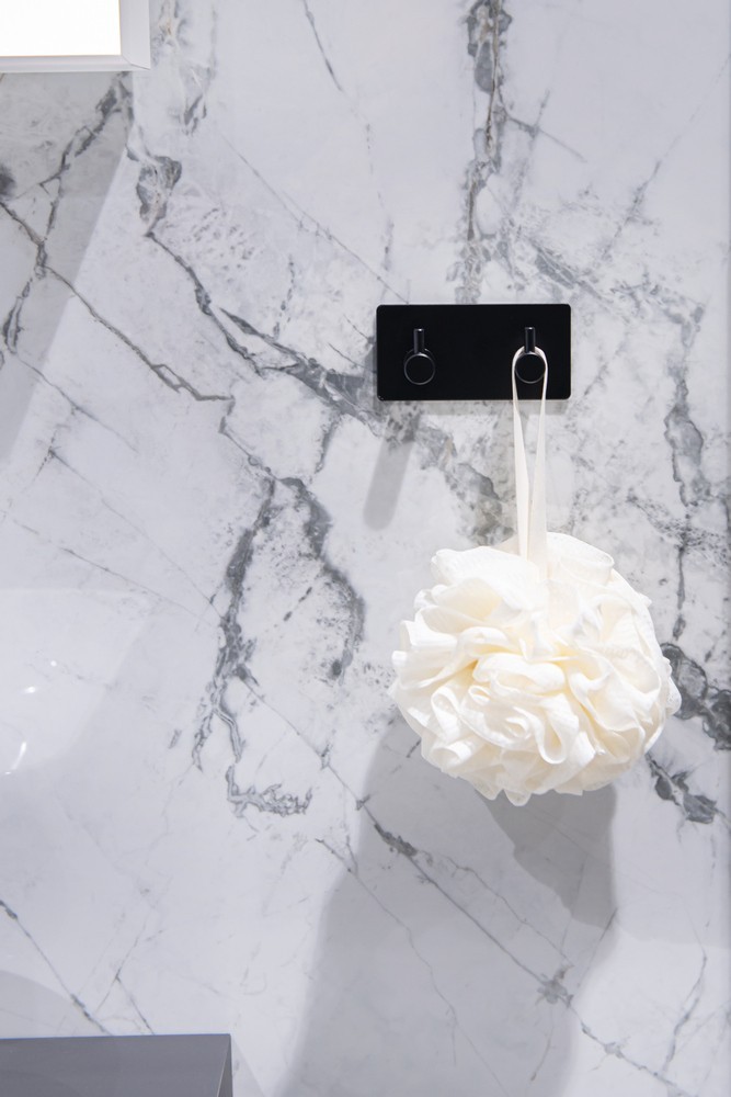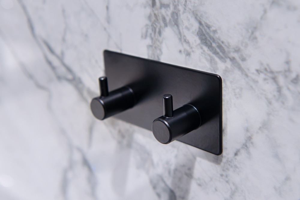 Hranatý 2-vešiak - háčik z kvalitnej, čierno lakovanej, ocele Najväčšou výhodou tohto vešiaka je jednoduché lepenie na obklady pomocou veľmi silnej 3M pásky. Samolepiace kúpeľňové doplnky sú ideálnym riešením, pokiaľ nechcete vŕtať do obkladov. Veľmi kvalitná lepiaca páska 3M priľne k rôznym povrchom a umožňuje ľahké odstránenie doplnkov bez zanechania stôp či poškodenia. Jeho maximálna nosnosť je 4 kg.