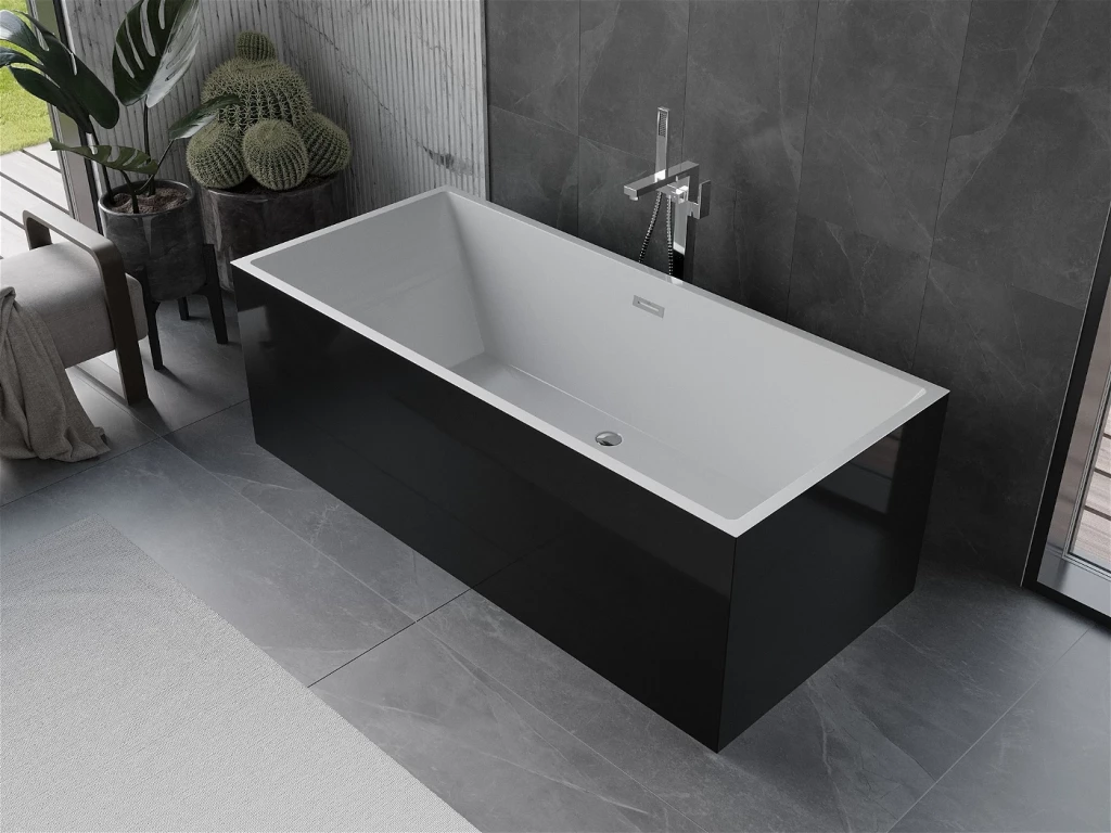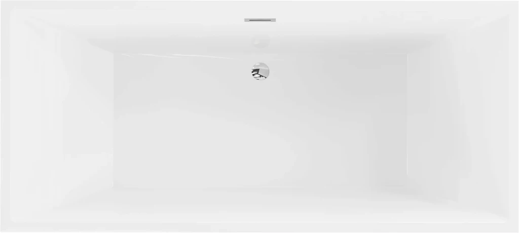 Voľne stojaca obdĺžniková akrylátová vaňa série VIGO od výrobcu MEXEN s prepadom a umiestnenom odpade na strede vane.