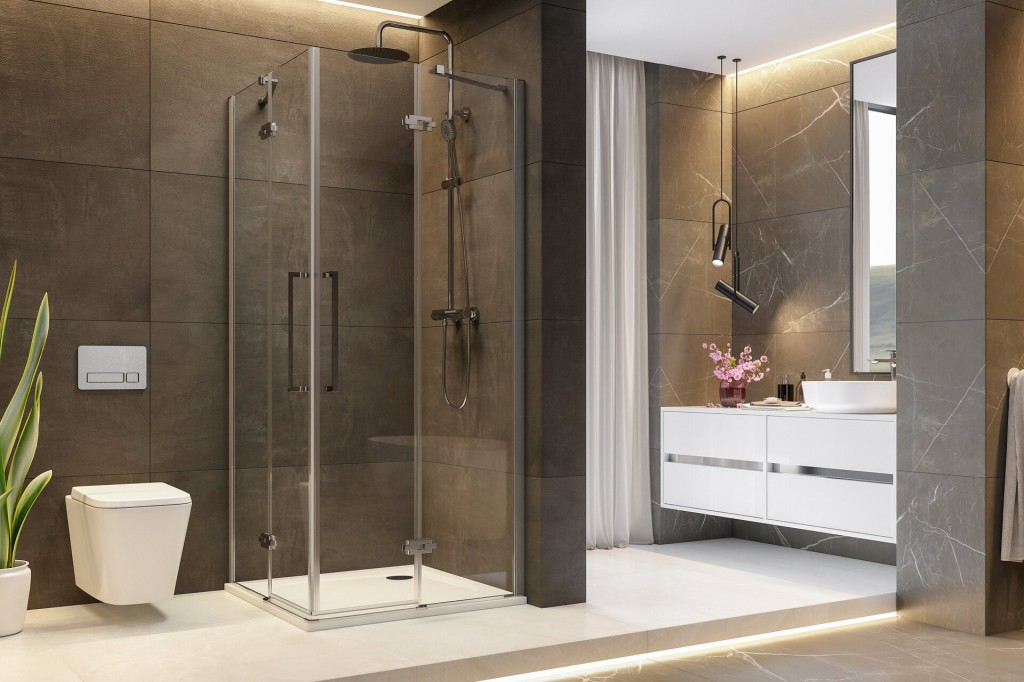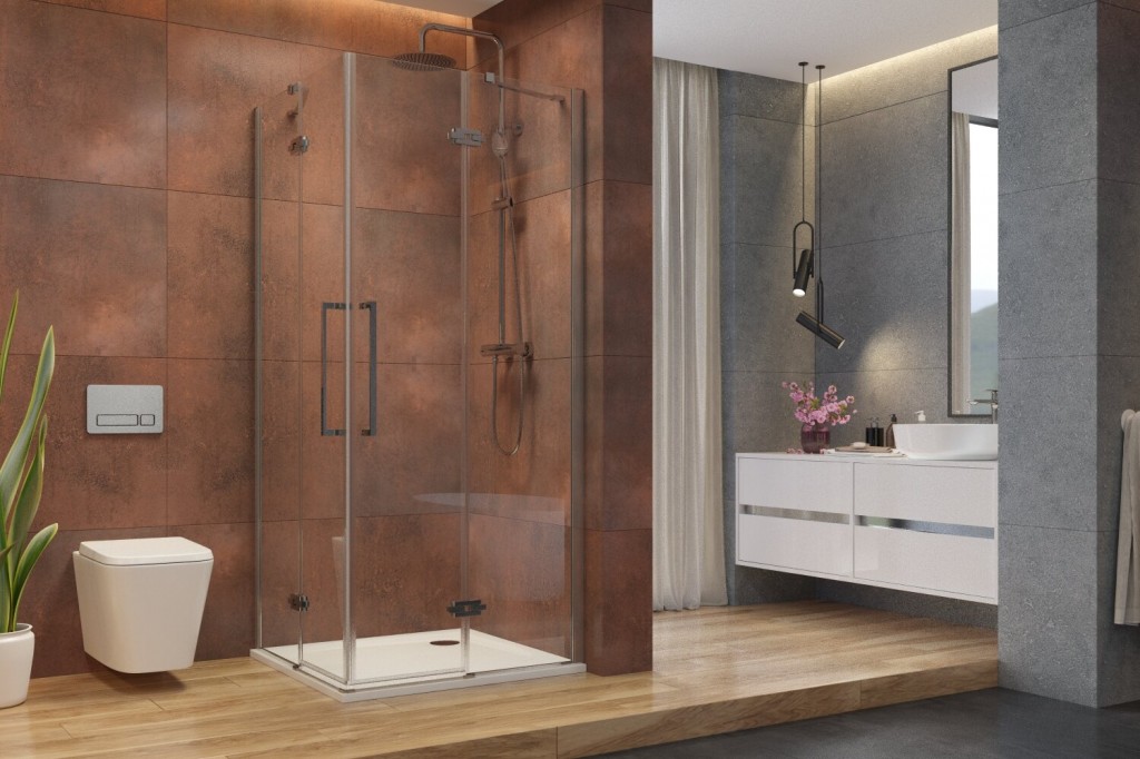 Sprchový kút štvorcový s dvomi otváracími dverami. Jedinečná a originálna séria trendových sprchových kútov s hranatými detailmi chrómových profilov, konzol, pántov a madiel.