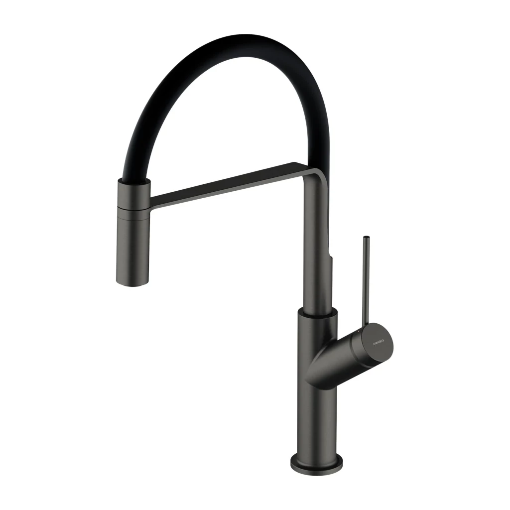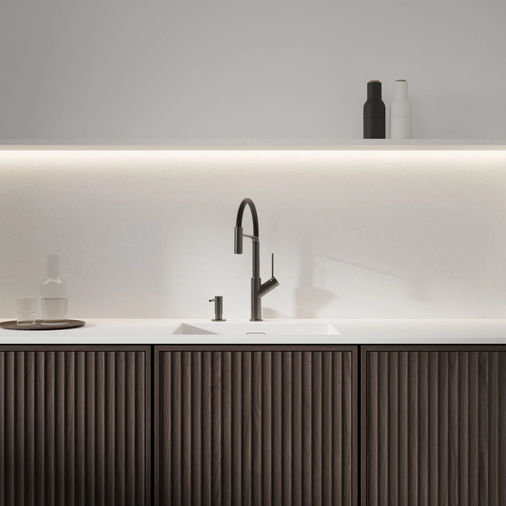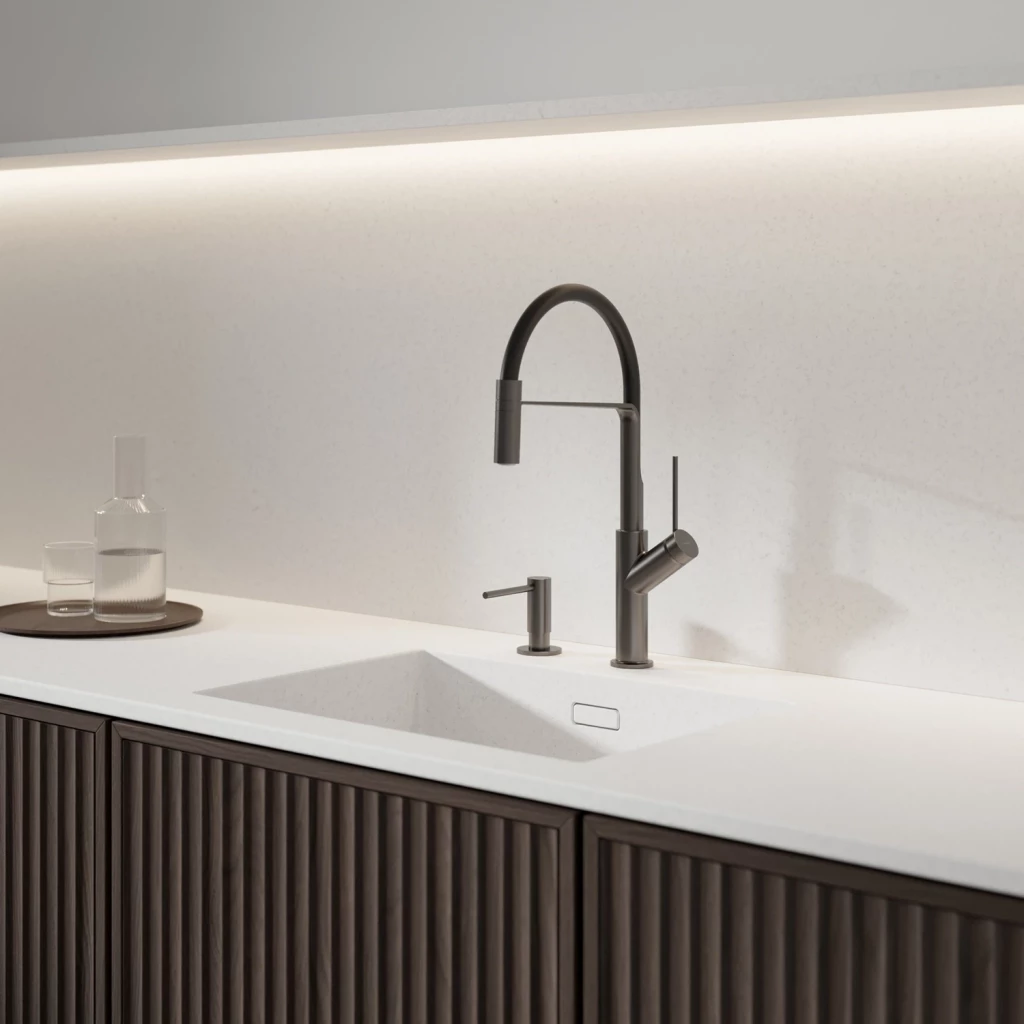 Kuchynská batéria OMNIRES VITA kombinuje vycibrený tvar s vynikajúcou funkčnosťou. Jej moderný, minimalistický dizajn je založený na geometrických tvaroch oblúka a vytvára ľahkú a vizuálne ucelenú siluetu. Otočný výtok s funkciou sprchy je možné oddeliť, čo umožňuje presný prietok vody, kamkoľvek je to potrebné. Flexibilná čierna gumová časť a optimálna výška batérie uľahčuje každodenné používanie. Tento model je vybavený vysoko kvalitnou keramickou kartušou a inovatívnymi technologickými riešeniami, ktoré znižujú spotrebu vody na polovicu a zároveň zaisťujú pohodlie a jednoduché používanie.