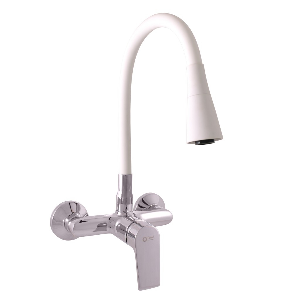 Vodovodná batéria drezová nástenná s flexibilným otočným ramienkom so sprchou.