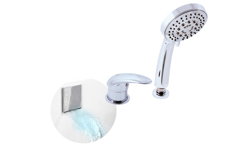 Vodovodné batérie vaňová stojanková trojotvorová s prepínačom v mixe, vodopádovým výtokom VOD6301, samonavíjacie sprchou a 2m hadicou.