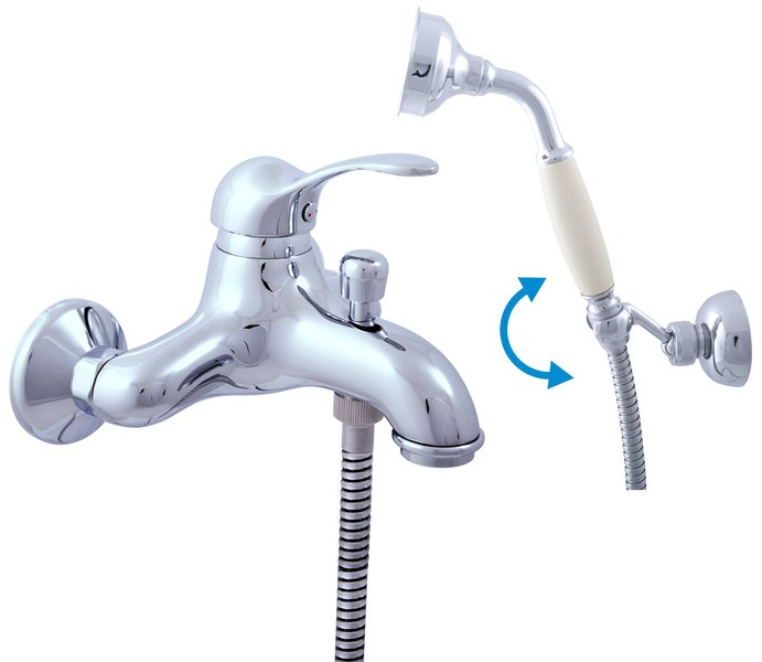 Vodovodná batéria vaňová nástenná so sprchou a otočným držiakom.