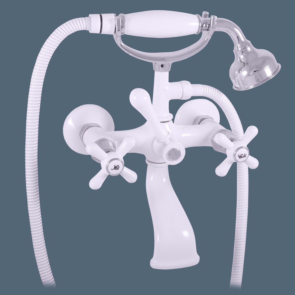 Vodovodná batéria vaňová nástenná s vidlicou na odkladanie sprchy a so sprchou.