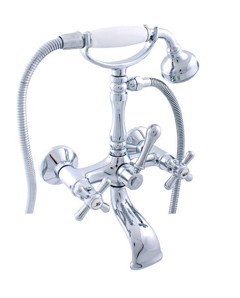 Vodovodná batéria vaňová nástenná s vidlicou na odkladanie sprchy a so sprchou.